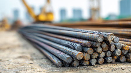 A close-up view of steel rebar showcases its textured surface at a bustling construction site, with heavy machinery subtly blurred in the background, depicting industry and strength.