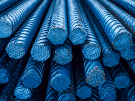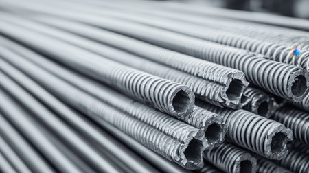 This detailed image showcases a close-up view of stacked industrial steel rebar, highlighting its surface texture and structure, ideal for construction themes.