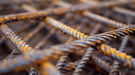 This image features a close-up view of steel reinforcement bars, showcasing intricate textures and structures essential for construction projects.