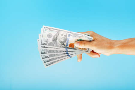A hand with one hundred-dollar bills on a blue background.