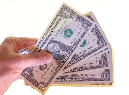 Hand giving dollar banknotes currency of the United States isolated over white
