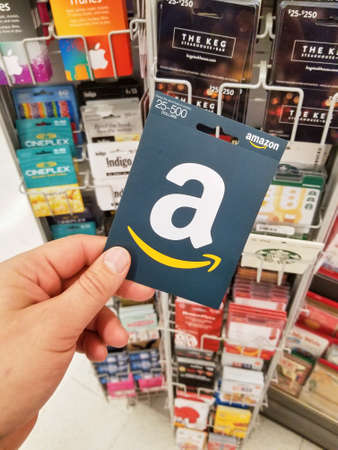 MONTREAL, CANADA - NOVEMBER 7, 2017: Amazon gift card in a hand on gift cards background. Amazon is an American electronic commerce and cloud computing company based in Seattle, Washington