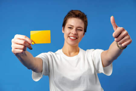Image of young woman holding business card with copy space on blue background
