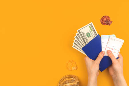 Summer travel by airplane background with boarding pass and passport with money in woman hand, seashells, flat lat and copy space