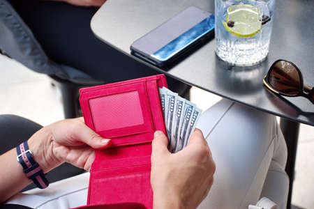 Midsection of the young woman paying bill in the restaurant. Red wallet with dollars