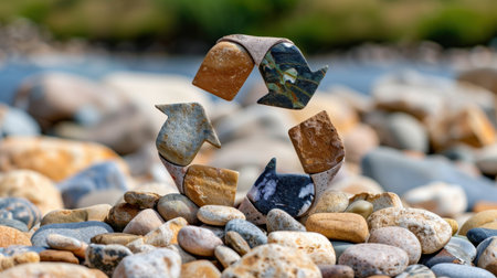Colorful stones arranged to create a recycle symbol on a sandy beach, showcasing environmental awareness and natural beauty. Perfect for sustainability themes and eco-friendly concepts.