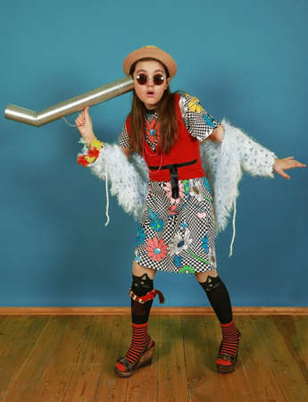 Little girls wearing a colorful wig and heart-shaped sunglasses posed for a photo shooting on the disco light background
