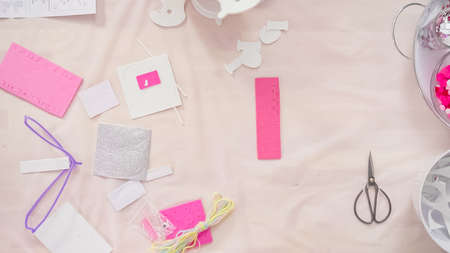 Flat lay. Step by step. Woman making a unicorn figurine out of the white and pink paper foam.