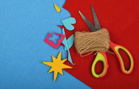 Craft and art, felt pieces, cuts, jute twine thread bobbin and scissors on red and blue background