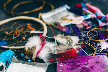 Colorful bright dreamcatcher components. Handmade accessory for bedroom decoration. Creativity, handmade, handicraft concept