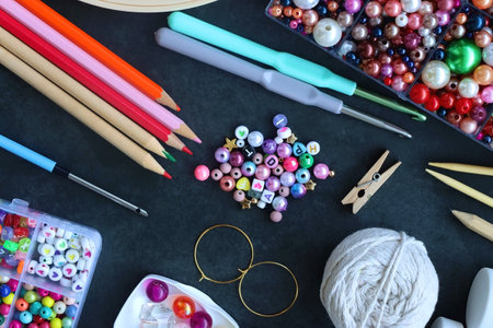 Colorful beads, coloring pencils, glitter, needles, string, hoop, tape and scissors on dark background. Various colorful craft supplies. Flat lay.