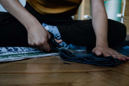 woman mending pants by hand with a pair of scissors, entrepreneurship, exploited worker