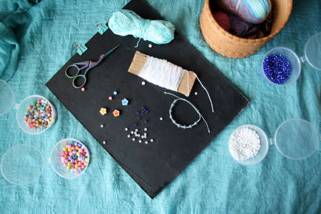 Creating Christmas ornaments. Handcraft artist workspace. Laptop, colorful beads, felt, tools, scissors, needles, thread spools, glue, containers, pliers, wire. Creative chaos concept. Flat lay.