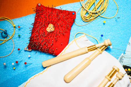 Sewing instruments, threads, needles, bobbins and materials. Studio photo