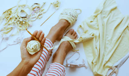 Top view leisure activity to make handmade sandals from old T shirt, Vietnamese woman recycle by cut clothes to make yarn ball then crochet, human foot diy thongs on white background