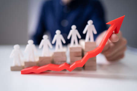 Businessperson's Hand Holding Red Arrow In Front Of Human Figures On Wooden Staircase