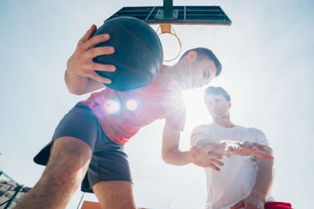 Street basketball. Youth, friends, play outside, attack. Blurred background. Active lifestyle and sports among young people