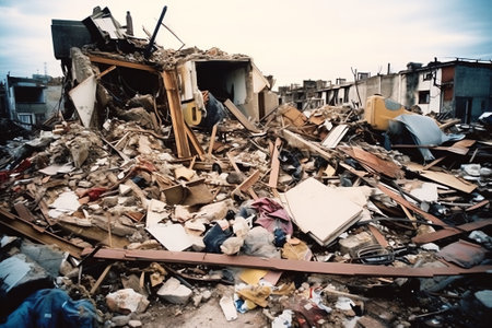 AI Generated. Demolished building debris poses hazard on ground