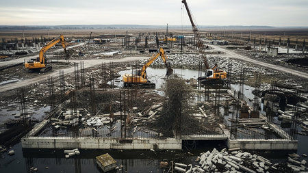 A wide shot of a construction site with multiple excavators and cranes working around concrete foundations and piles of rebar in a flooded area.