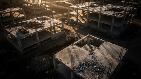 An overhead view of an unfinished concrete building site exposed rebar and scattered bathed in warm sunlight.