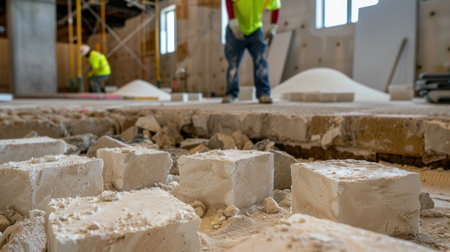 Crushed cinder blocks and construction waste spread across a dusty demolition site.