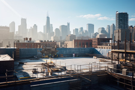 Rooftop view of city construction site, rooftop of an apartment building under construction with tower crane , AI generated