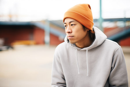 young asian man in a beanie and graphic tee at a skate park