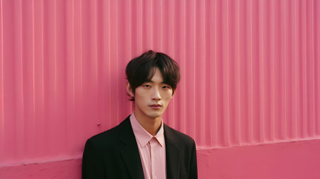 Portrait of a handsome young asian man wearing a black suit and pink shirt.