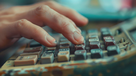 A person is typing on a calculator with a green and brown keyboard. The calculator is old and has a vintage look to it