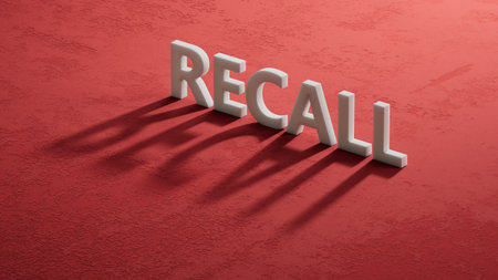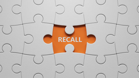 Recall written on The white puzzle pieces with missing pieces on wooden background.close up of The white puzzle pieces with missing pieces,Business Concept.3D rendering on orange background.