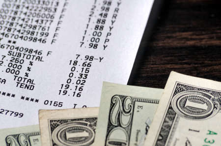 American money dollars and receipt close-up. color image in horizontal orientation