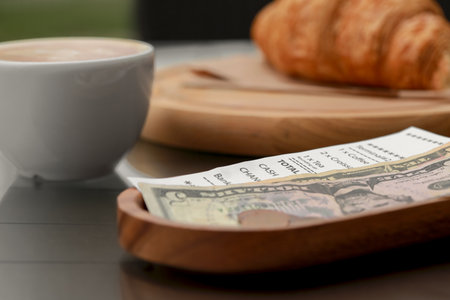 Wooden plate with payment for order and receipt on table, closeup. Leave tip