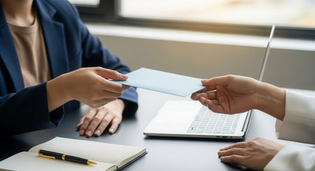 Businesswomen exchanging a light blue envelope across a desk in a professional office setting. symbolizes transaction, payment, agreement, or confidential communication.