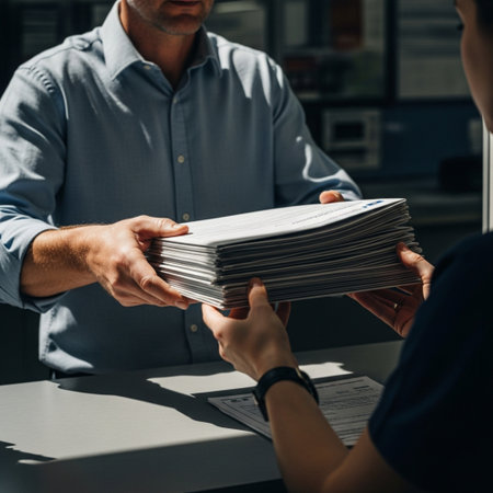 Stressed business owner dropping off a stack of critical sealed documents at a post office counter.