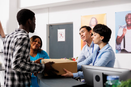 Side view close up at two people handing cardboard box while standing by self storage unit or postal boxes, copy space