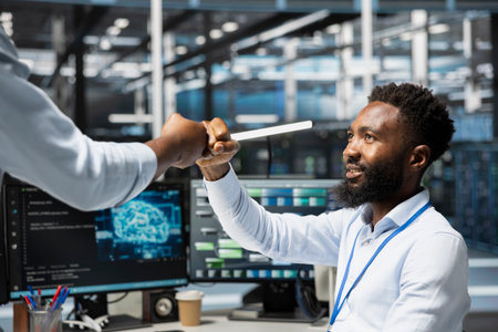 Server room worker greeting colleague, dong fist bump, using AI tools. Engineer saluting coworker, setting up data center equipment needed to run artificial intelligence and machine learning processes