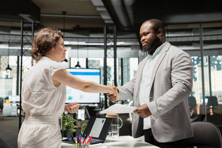 Handshake concludes successful interview between recruiter and job seeker, showcasing agreement on employment legal terms and preparation for onboarding on the team. Career advancement.