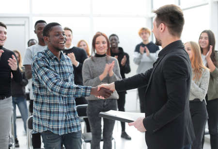 Two dark-skinned men shake hands and smile in honor of the future cooperation of their firms. Office shooting