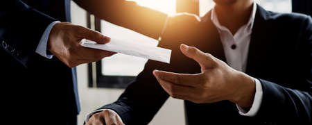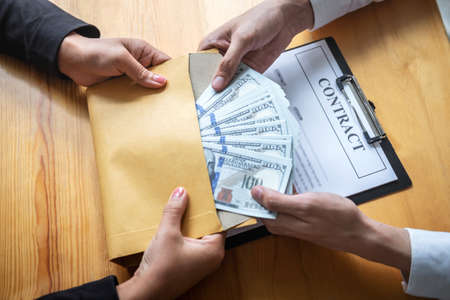 Dishonest cheating in business illegal money, Businessman giving bribe money in envelope to business people to give success the deal contract of investment, Bribery and corruption concept.