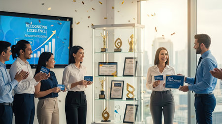 A business team celebrates success indoors, likely in an office setting. They are seen giving and receiving certificates and awards. The scene is brightly lit by natural light, suggesting a daytime event. This image could be used for various commercial or editorial purposes.