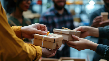 Group of people holding gift boxes during charity day, symbolizing generosity and community spirit