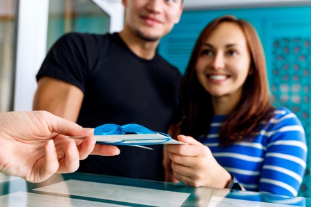 Receptionist woman gives certificate to visit of spa salon.