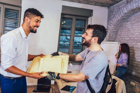 Delivery man package delivery at office.