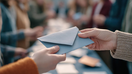 Medium shot of hands exchanging donation envelopes at an ecorestoration fundraiser event symbolizing community support and environmental funding.