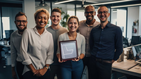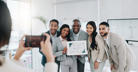 Picture, award and teamwork with business people in office for winner, support or photographer. Certificate, thank you and achievement with employees in engineering firm for partnership or well done