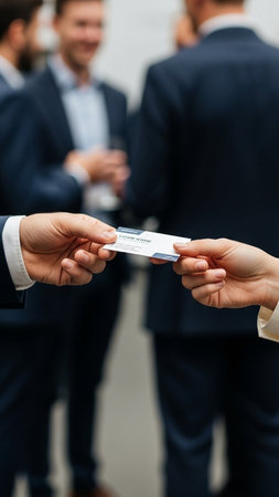 Close-up of two hands exchanging a business card in a bustling professional environment, highlighting the importance of networking and relationship building.
