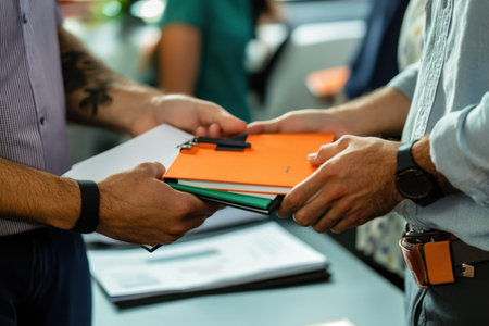 Two men are holding papers and one of them is wearing a watch. The scene appears to be a business meeting or a work environment