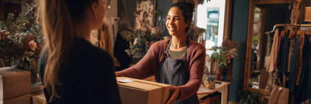 A friendly shop assistant delivers an online order to a happy customer in a warm, inviting boutique filled with unique items and decorations.