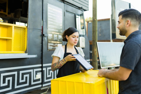 Woman stall vendor showing the digital menu to a young man customer of the food truck