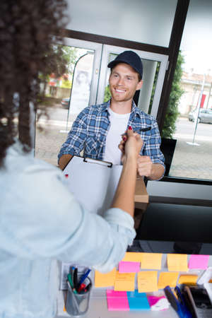 Young smiling woman giving the packed parcel to delivery man they working in delivery service